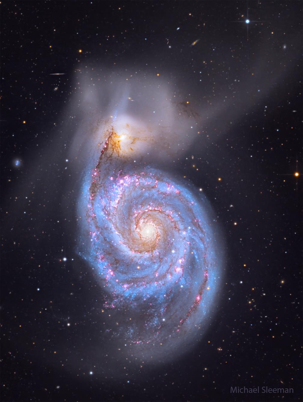 The Whirlpool Galaxy is a classic spiral galaxy. At only 30 million light years distant and fully 60 thousand light years across, M51, also known as NGC 5194, is one of the brightest and most picturesque galaxies on the sky. The featured deep image is a digital combination of images taken in different colors over 58 hours with a telescope from Lijiang, China. Anyone with a good pair of binoculars, however, can see this Whirlpool toward the constellation of the Hunting Dogs (Canes Venatici). M51 is a spiral galaxy of type Sc and is the dominant member of a whole group of galaxies. Astronomers speculate that M51's spiral structure is primarily due to its gravitational interaction with the smaller galaxy just above it.